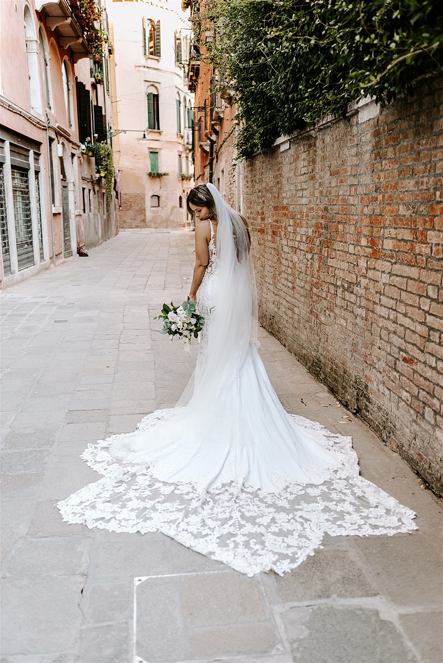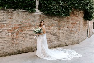 Romantic lace and a sweeping train are perfect for wandering the cobbled streets of Venice.