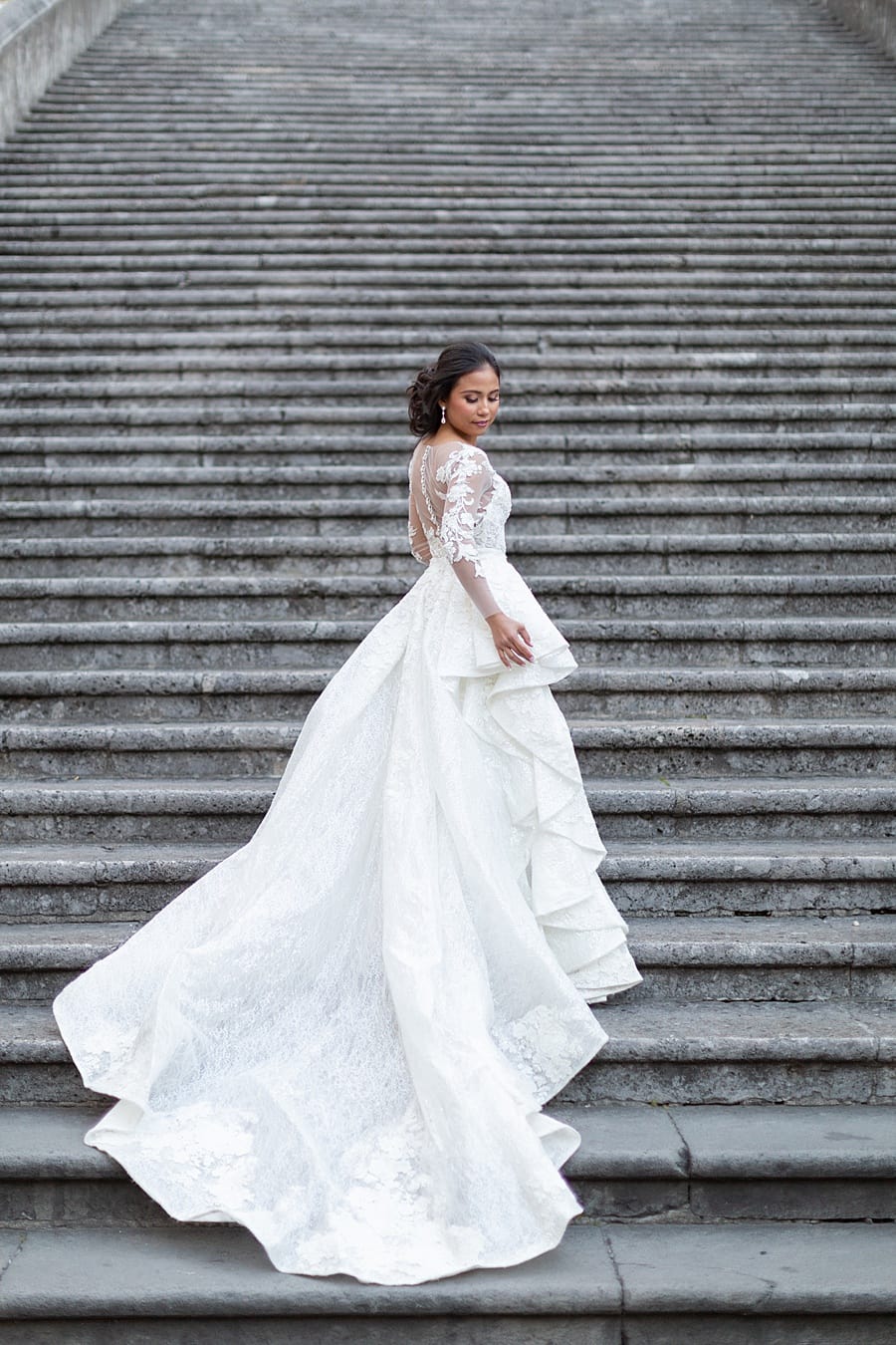 This voluminous ballgown with lace sleeves and cascading layers, perfectly complements the timeless architecture of this wedding’s European setting.