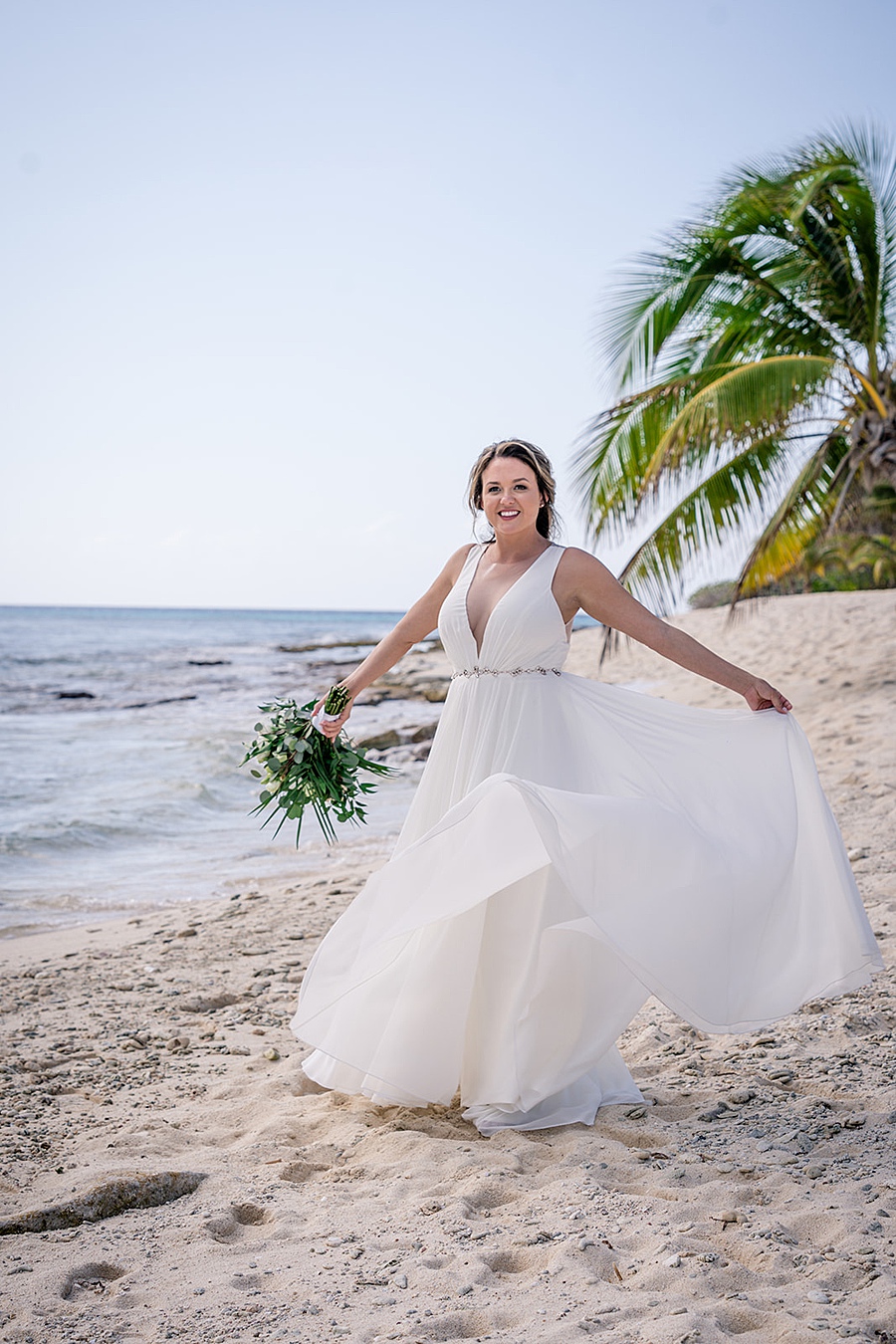 This bride’s simple V-neck gown twirled beautifully on the sand, showing how effortless fabrics shine by the sea.