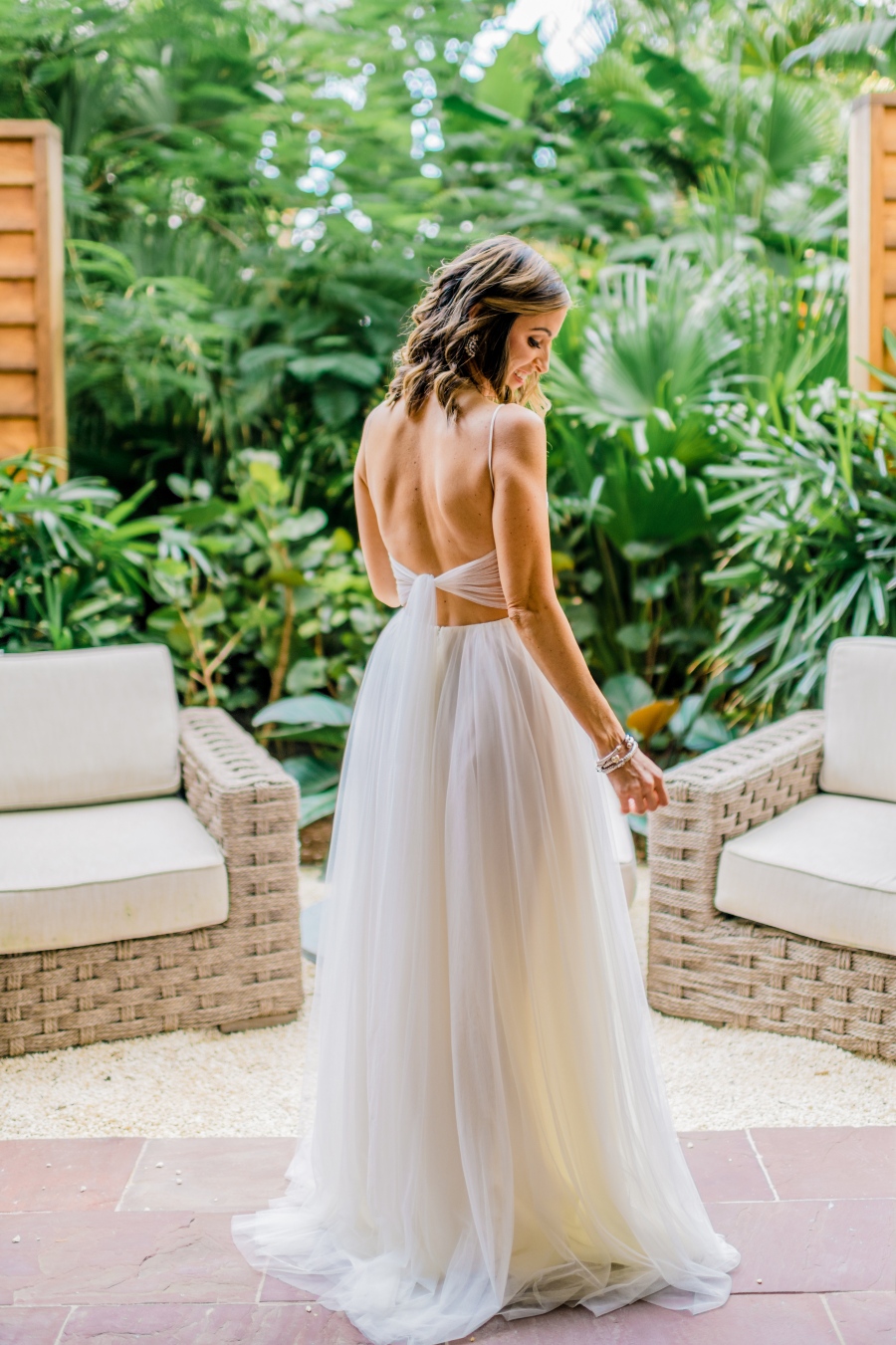 This backless gown with a soft tulle skirt proves that lightweight styles can still feel glamorous in tropical settings.