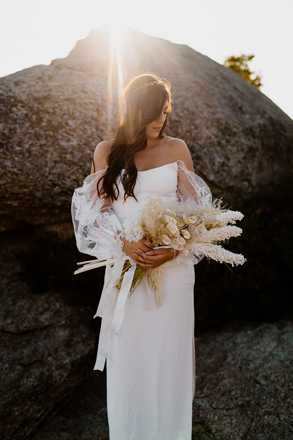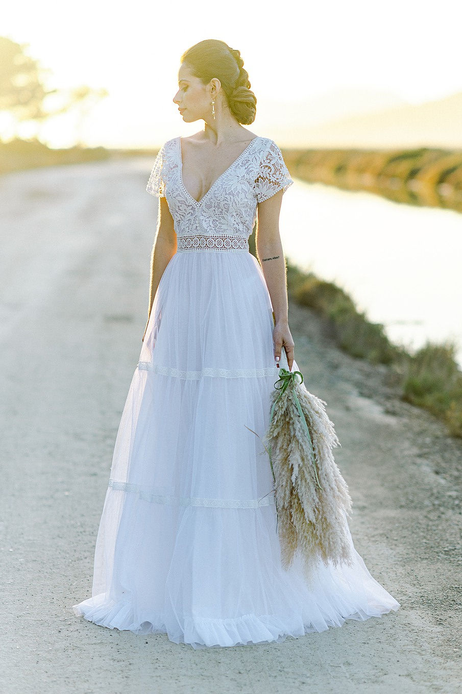 Delicate lace sleeves and a tiered skirt gave this gorgeous wedding dress a romantic, boho vibe at golden hour.