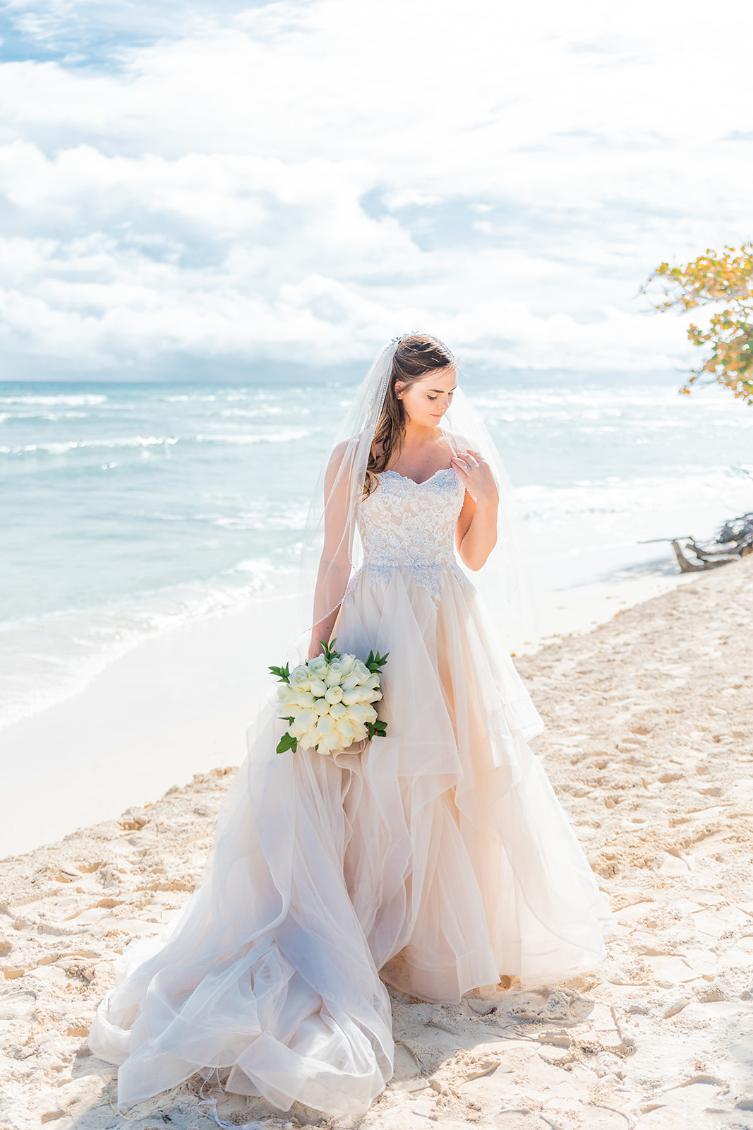 Layers of tulle with a subtle blush undertone gave this bride’s beach gown a romantic, ethereal look — proof that destination wedding dresses don’t have to be all white to be stunning.