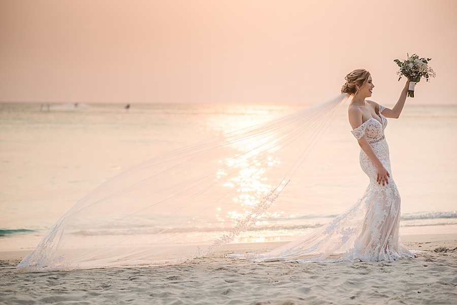 Romantic lace details and an extended veil made this bride’s look unforgettable against the sunset backdrop.