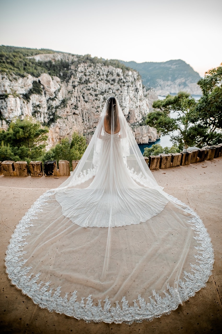 This Ibiza bride proves that a dramatic train is worth the extra wow-factor. Flowing lace and tulle cascade beautifully against the cliffside backdrop, showing how a statement train can elevate destination wedding photos.