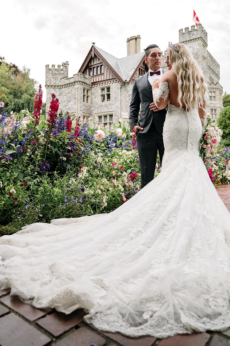 This regal gown with intricate lace and dramatic train was the perfect fit for this fairytale castle setting.