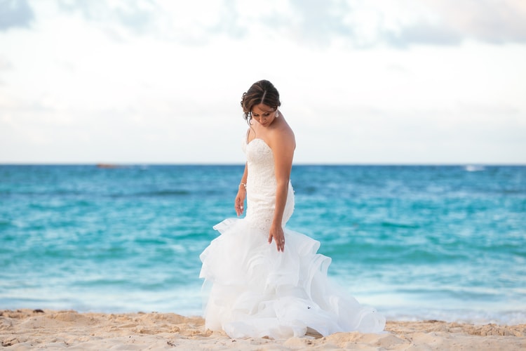 A flowing gown with a dramatic train captured the romance of the setting sun. This shows that the right destination wedding gown with a train can be breathtaking on the beach.
