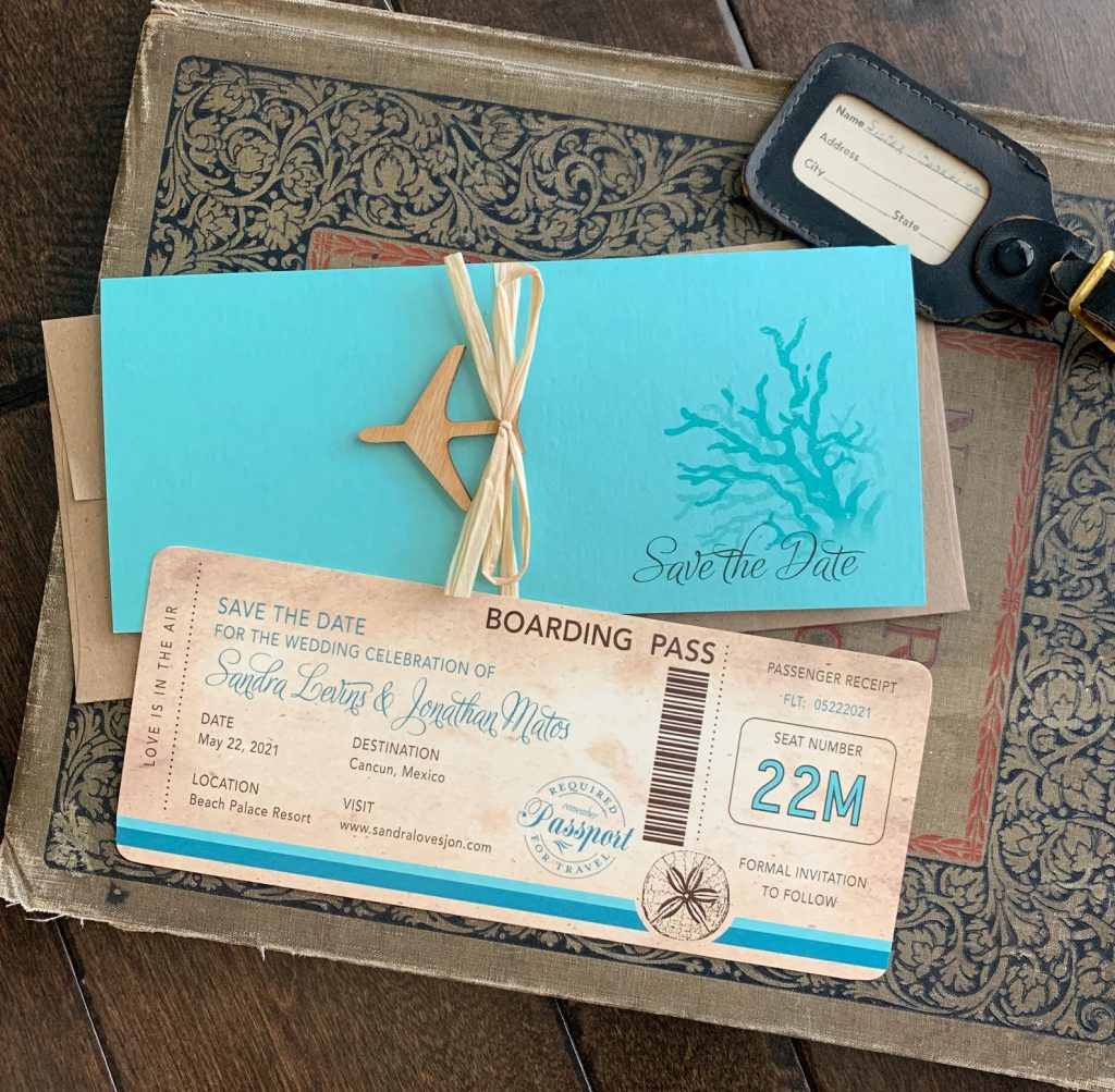 Chances are, your guests will be on board with your destination wedding when they receive this cool boarding pass save the date! When I tied the knot, I created a set of multi-page boarding passes as my destination wedding invitations. The concept can easily be adapted to a destination wedding save-the-date. Since there’s less information to communicate, you just need to mail out one boarding pass card with the date, location, and trip information.