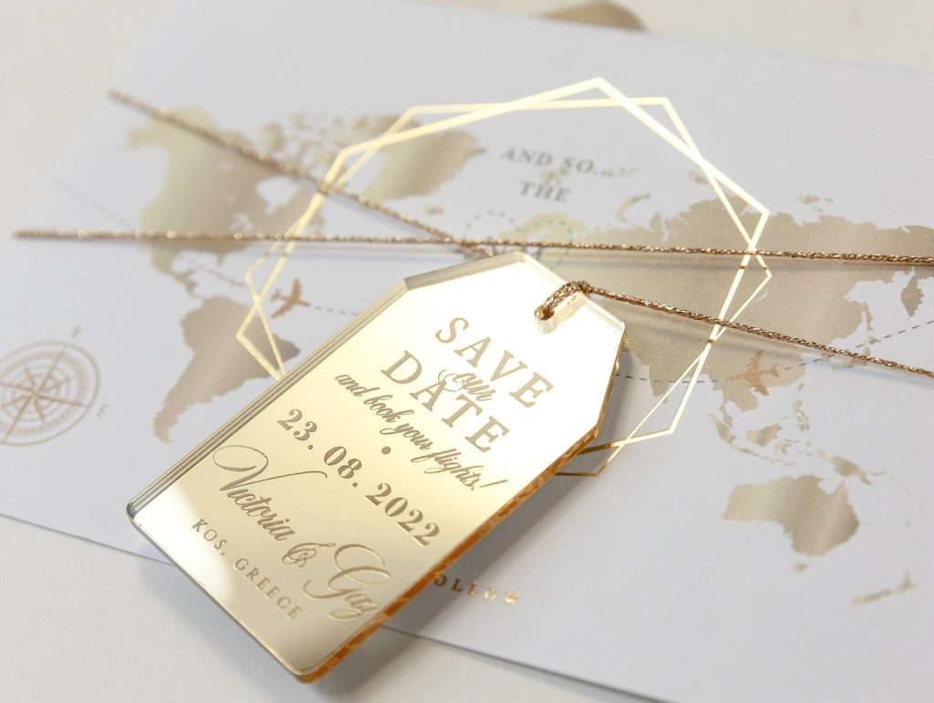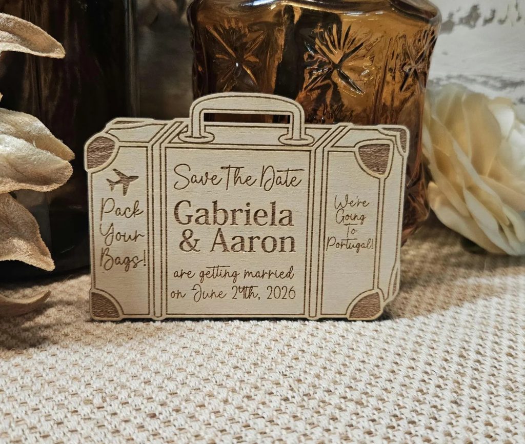 We love these adorable and unique these save-the-dates which are laser-cut wood in the shape of a suitcase with a heavy duty magnet attached to the back.