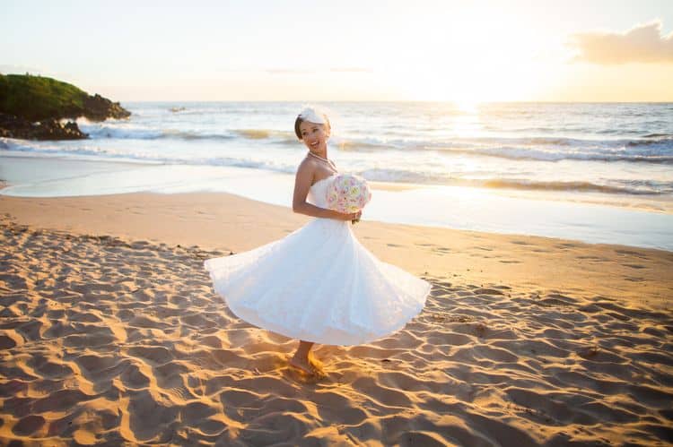 - Trash-the-Dress Session – Heading into the ocean, rolling in the sand, or running through sprinklers for those epic photos? A short beach wedding dress is perfect for this—you’ll look fabulous and won’t worry about wrecking layers of tulle.